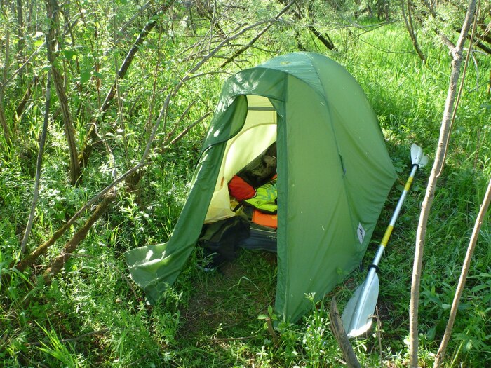 Двигаюсь еще с час, нахожу хорошее пустынное место, и заволакиваю лодку глубоко в кусты, там же ставлю палатку. Отчего-то хочется отгородится от мира. Где-то совсем рядом крякает утка. Ужинаю, сколько влезет и засыпаю. Ночью слышу как утка крякает возле палатки, затем у воды и наконец затыкается. Под утро прошел небольшой дождь, но песок быстро сохнет.