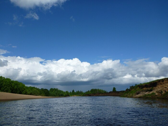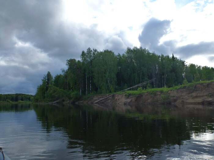 Кочевский район относится уже к местностям, приравненным к Северу, с которого подул ветер, стало холодно, так что я сперва одел куртку, а затем, под нее, спасжилет, так было более-менее тепло. Тучи ходили кругами, или это река петляла. Раза три шел дождь, от которого я спасался под пончо, накрываясь вместе с рюкзаком.