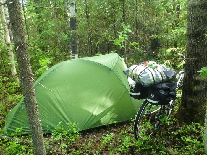 Я заехал неглубоко в лес, отошел метров 20 от дороги, под накрапывающим дождем поставил палатку, закинул внутрь рюкзак и забрался сам. Внутри зажег горелку, и в маленькой палатке сразу сделалось жарко, перекусил, повесил штаны под потолок, постелил коврик, сверху куртку, выключил газ и в спасжилете забрался в спальник, думая, что в принципе, жить можно... однако ночью я уже думал иначе. Под тент поддувало, было холодно и я мерз. Дальше я зажег горелку и дремал вполглаза. Мерзнуть дальше я был не в силах. Горелку я включал дважды за ночь, на время не смотрел, но к утру баллон полегчал.