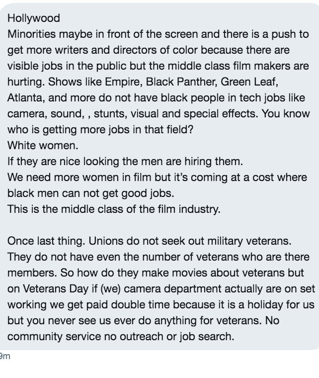 Меньшинств много на переднем плане и есть давление, чтобы было больше цветных (POC - people of color) сценаристов и режиссеров, потому что это публичные работы и таких людей видно, но в "среднем классе" людей, причастных к кино, все обстоит иначе. В таких шоу как Империя, Черная Пантера, Гринлиф, Атланта (прим. - все это сериалы, где среди создателей негры) нет ни одного негра на технических работах таких как камера, звук, каскадерские трюки, визуальные эффекты и спецэффекты. А знаете, кто получает большинство работ в этой сфере?