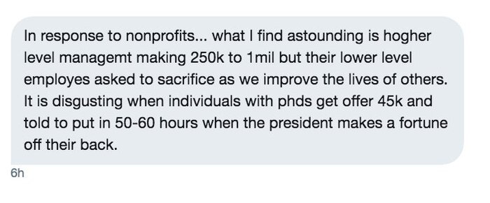 В ответ про благотворительность...Что я нахожу невероятным, так это то, что топ-менеджмент получает от 250к до миллиона долларов, в то время как от рядовых работников в благотворительности требуют жертвовать собой, так как "мы улучшаем жизни других". Отвратительно, когда люди с докторской степенью получают 45к и работают по 50-60 часов в неделю, в то время как президент фонда наживается на их горбу