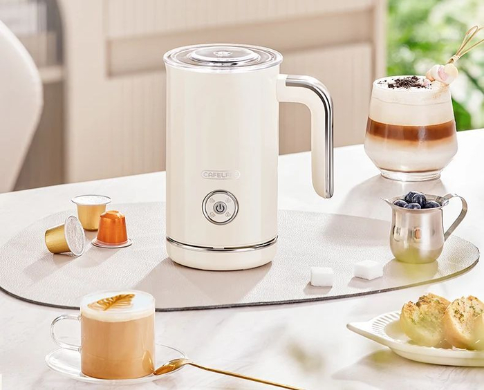 Замечательная идея для ценителей кофейных напитков, молочных чаёв и какао — удобный электрический девайс, позволяющий приготовить две разновидности молочной пены для горячих и прохладных коктейлей вроде капучино либо латте, разогреть молоко или сделать горячий шоколад. Управление интуитивно понятное, всего одна кнопка. Бак выполнен из нержавеющей стали AISI 304. За считанные секунды устройство создаёт пышную пену и подогревает жидкость до оптимальной температуры +65°C. Работает совершенно бесшумно и выглядит стильно.