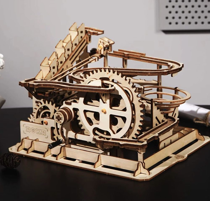 Удивительные механические наборы от бренда Robotime, которые можно собрать вручную. Деревянные детали вырезаны из тонкой фанеры лазером с идеальной точностью. Сборка всех деталей производится без применения клея, что добавляет процессу особую привлекательность. Постепенно соединяя компоненты, владелец получает готовую действующую механическую конструкцию, полную подвижных узлов. Приводится механизм в действие специальным рычагом, при повороте которого внутри машины двигаются десятки стальных шариков. Каждый набор предполагает создание одной из четырёх возможных моделей, состоящей приблизительно из трёхсот элементов и занимающей несколько часов свободного времени для завершения сборки.