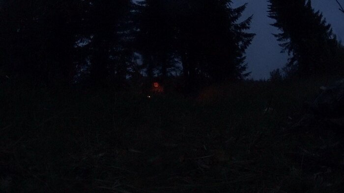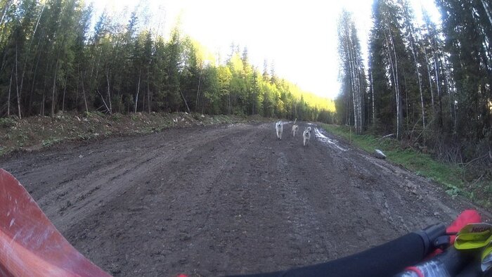 На очередном, особо грязном подъеме из леса выбежали три белые лайки и замерли, уставившись на меня в недоумении, не понимая, что за существо перед ними. Но, когда услышали голос, подбежали и дальше сопровождали меня до темноты, бегая туда-сюда, то отставая, то обгоняя. (Это хорошая примета, как я потом выяснил в интернете. Если за тобой увяжется чужая собака - добрый знак, а встретить сразу трех белых собак - к большой удаче).