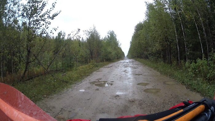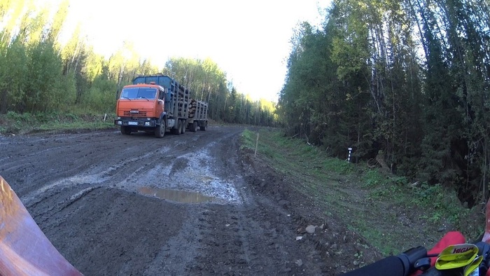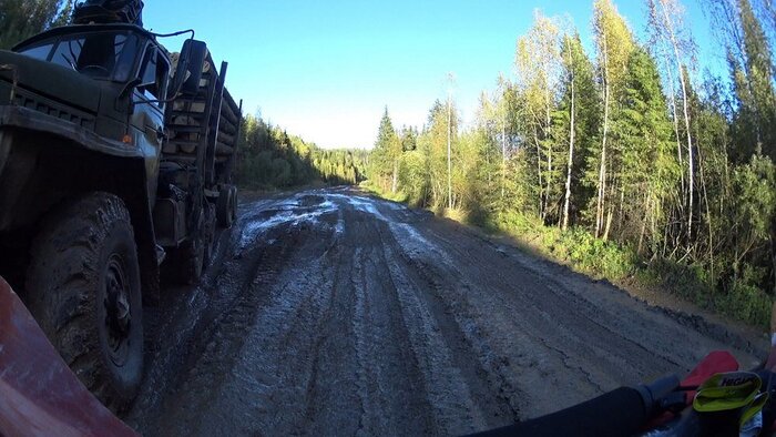 Дальше дорога раздавлена лесовозами, сыро, бугры, ямы, крупный булыжник.