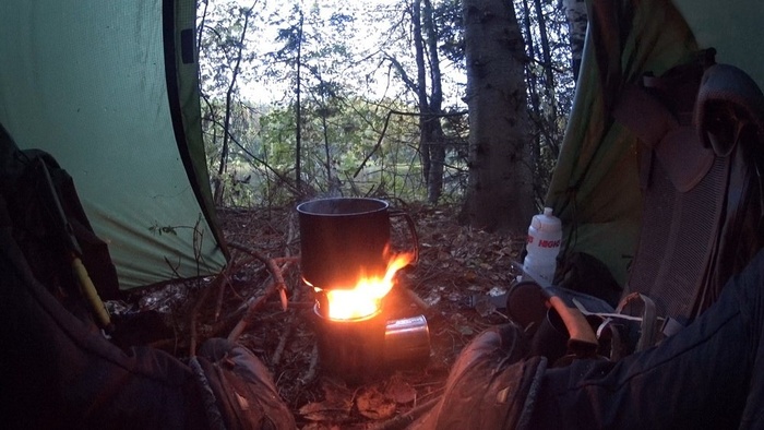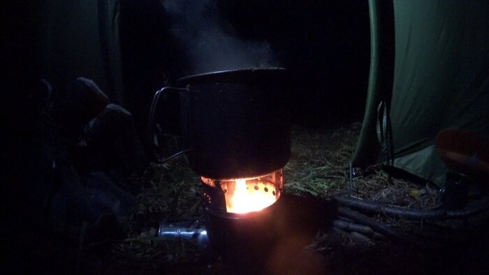 Понятно, что чем тоньше ветки, тем быстрее они прогорают, поэтому за процессом горения надо постоянно следить одним глазом, и подкладывать дрова, не доводя до полного прогорания углей. Которых с наддувом практически не остается, получается даже не зола – пепел. Так же, как и для газа, надо городить ветрозащиту. Искр мало, но они есть, вблизи палатки использовать надо аккуратно. Остается выжженое пятно, но только на поверхности земли. Металл понемногу обгорает, каков срок жизни нержавейки сказать сложно. Посуда, понятное дело, будет в копоти. В целом, мое мнение о турбопечке положительное.