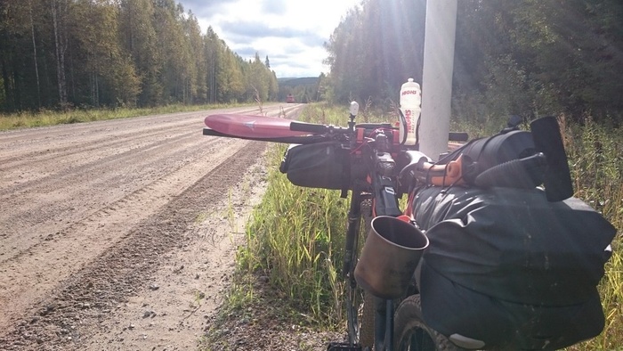 ... К вечеру 11 сентября я проехал Красновишерск, попетлял по плохой грунтовке и вскоре уперся в железные ворота базы отдыха на берегу Вишеры, сторговался со сторожем на 10 суток стоянки и приступил к сборке велосипеда. Изначально я хотел разместить палатку с ковриком на руле, поверх сумки с лодкой, но на месте выяснилось, что ехать так невозможно даже на заблокированной вилке, поскольку сумка на кочках нижней частью касается колеса. Поэтому пришлось скрепя сердце уложить палатку без каркаса и коврик под клапан рюкзака. В итоге все поместилось так:
