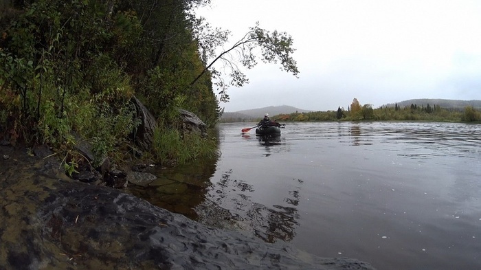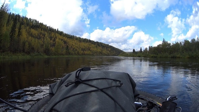 Внутри лодки места впритык, и в ноги человеку среднего роста можно поместить что-то размером с мяч. На носу имеются четыре петли, велосипедная МТБ рама без колес помещается нормально. Грести мешает, время от времени цеплял веслом, но терпимо. Еще про багаж. Поначалу я сел на надувную сидушку, рюкзак клал на переднюю палубу и сзади, за собой, сумку клал под колени. Поначалу казалось, что нужны петли для груза сзади, на горбу, но через пару дней гребли, я пришел к выводу, что более высокая посадка удобнее, и сел на рюкзак, а все остальное поместил в нос или на палубу спереди и такая компоновка оказалась оптимальной. Если выразиться кратко - в пакрафте тесно. Но его любой способный подтянуться юноша может повесить на плечо и зашагать в гору. Комфортность посадки зависит от того, что вы под себя положите. Я начинал ерзать часа через полтора.