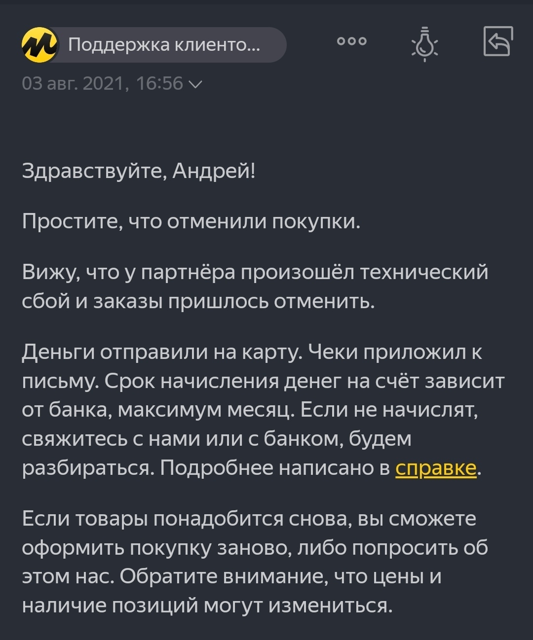 В 11 утра без предупреждения отменили мой заказ. Вернули деньги на счёт