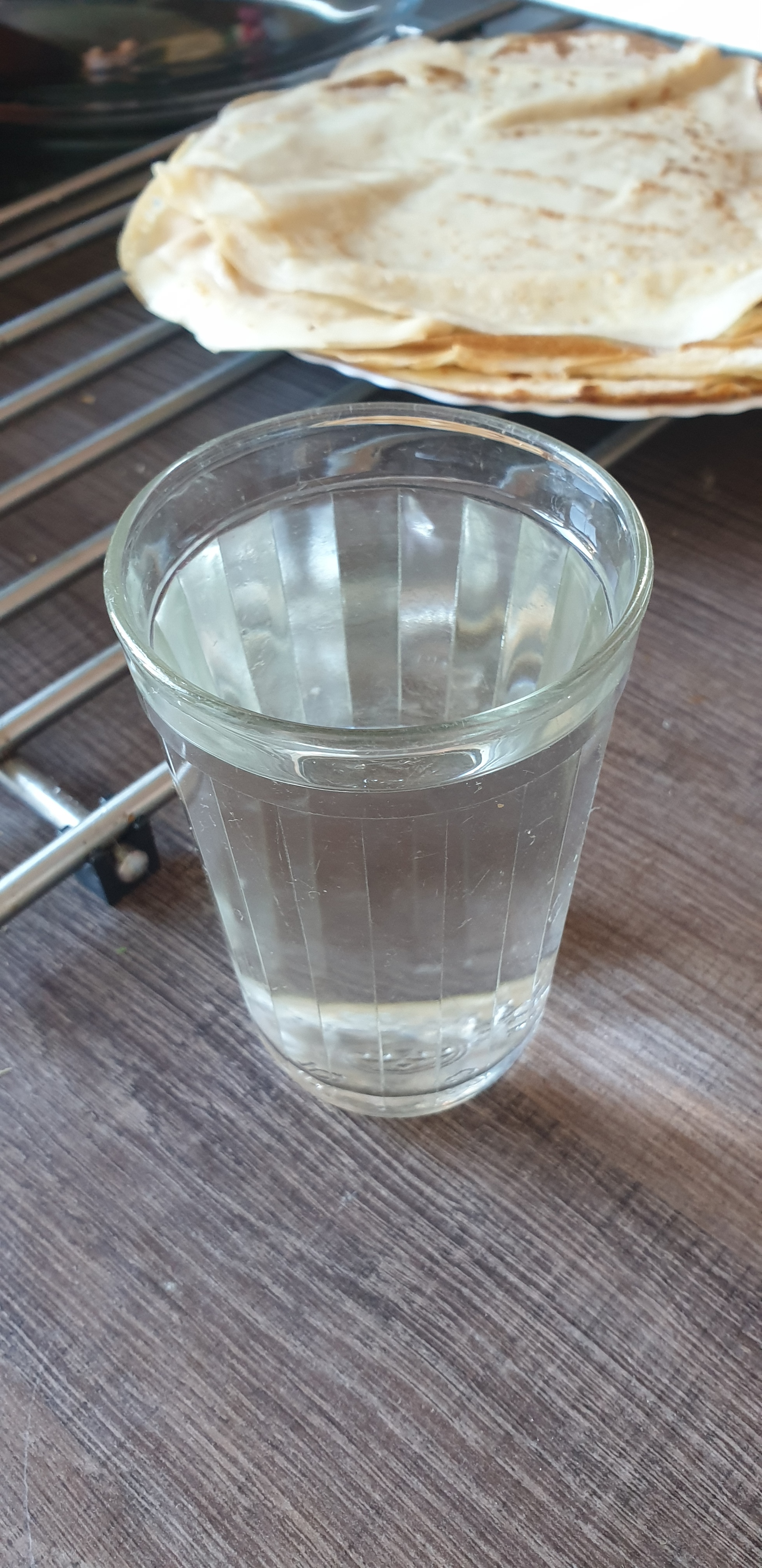 Теперь самое важное: постепенно вливаем стакан кипятка, постоянно мешая тесто венчиком, чтобы кипяток заварил муку и блинчики получились тающими во рту🧈