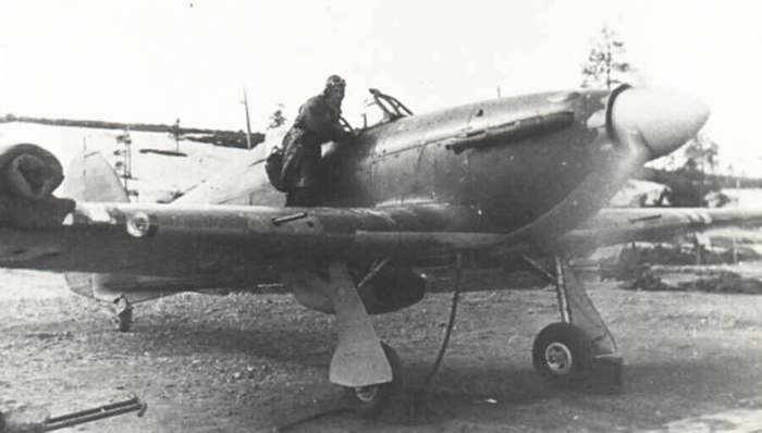 Советский ас Сафонов Б.Ф. на крыле "Харрикейна", на самолете установлены пушки ШВАК и подвески под РС.