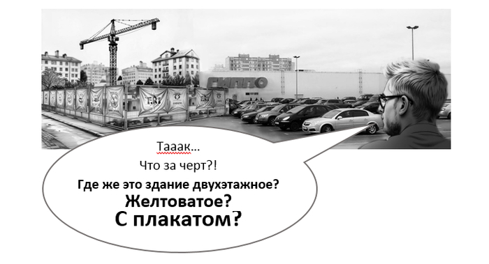 Мы вышли якобы покурить, и я увидел, что на том месте, где вроде как должно быть то самое желтоватое здание, расположен забор с рекламными баннерами, а за ним гудит стройка.