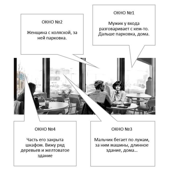 В этой кафешке, за спиной у Любы, было четыре больших окна. Она попросила меня описать, что я вижу в каждом окне. Начать с того, которое расположено у входа в кафе, справа от меня. Сказала, что для нее это очень важно.