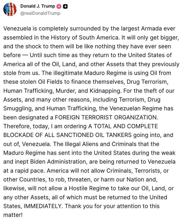 Венесуэла полностью окружена самой большой армадой, когда-либо собранной в истории Южной Америки. Она будет только расти, и шок для них будет ни на что не похож из того, что они когда-либо видели раньше - До тех пор, пока они не вернут Соединенным Штатам Америки всю нефть, землю и другие активы, которые они ранее украли у нас. Нелегитимный режим Мадуро использует нефть с этих украденных нефтяных месторождений для финансирования себя, наркотерроризма, торговли людьми, убийств и похищений. За кражу наших активов и по многим другим причинам, включая терроризм, контрабанду наркотиков и торговлю людьми, режим Венесуэлы был признан ИНОСТРАННОЙ ТЕРРОРИСТИЧЕСКОЙ ОРГАНИЗАЦИЕЙ. Поэтому сегодня я приказываю ПОЛНУЮ И ВСЕОБЪЕМЛЮЩУЮ БЛОКАДУ ВСЕХ САНКЦИОНИРОВАННЫХ НЕФТЯНЫХ ТАНКЕРОВ, направляющихся в Венесуэлу и из нее. Нелегальные иммигранты и преступники, которых режим Мадуро отправил в Соединенные Штаты во время слабой и некомпетентной администрации Байдена, возвращаются в Венесуэлу быстрыми темпами. Америка не позволит преступникам, террористам или другим странам грабить, угрожать или причинять вред нашей нации, и, соответственно, не позволит враждебному режиму забрать нашу нефть, землю или любые другие активы, все из которых должны быть НЕМЕДЛЕННО возвращены в Соединенные Штаты. Спасибо за ваше внимание к этому вопросу! ДОНАЛЬД Дж. ТРАМП ПРЕЗИДЕНТ СОЕДИНЕННЫХ ШТАТОВ АМЕРИКИ