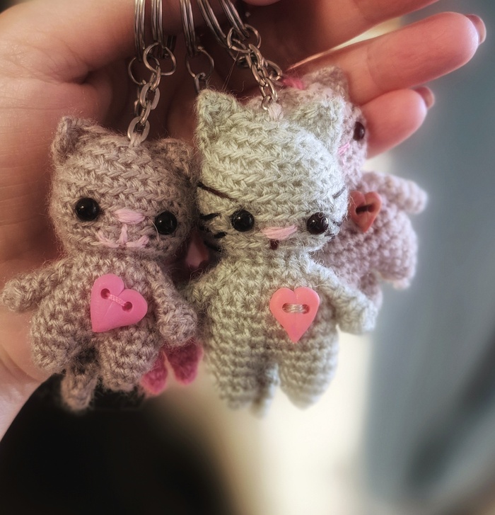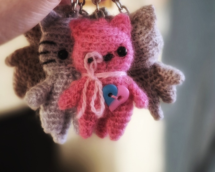 Почему мне захотелось попробовать именно маленькие игрушки? Хотелось вязаные брелочки на ключи, брелок из обычной хлопковой более крупной пряжи будет смотреться не очень на ключах и других не больших предметах. Мне кажется получилось очень даже неплохо .