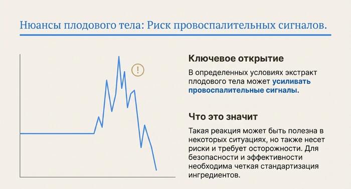 Нюансы плодового тела. В определенных условиях экстракт плодового тела может усиливать провоспалительные сигналы, что требует осторожности и четкой стандартизации ингредиентов.