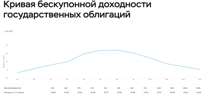 ✔️ Доходность большинства выпусков подросла до 14,7% (ОФЗ 26238 торгуется по 58,498% от номинала с доходностью 14,08%, вот вам и "безрисковый" актив). Если рассматривать данные ЦБ о средней max ставке по вкладам физ. лиц до 1 года в топ-10 банках, то во I декаде января она составила 15,102% снизившись (годичные ОФЗ дают доходность выше 14,5%). То есть, банки (при этом стоит учитывать нехватку ликвидности для ускорившегося кредитования) и рынок ОФЗ прайсят дальнейшее снижение ставки.