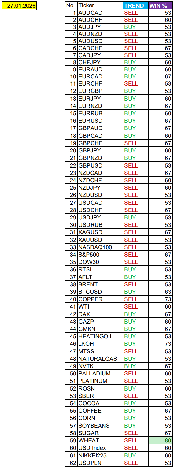 Очередные сезонные тенденции на вторник 27 января 2026 по основным мажорам финансовых рынков.