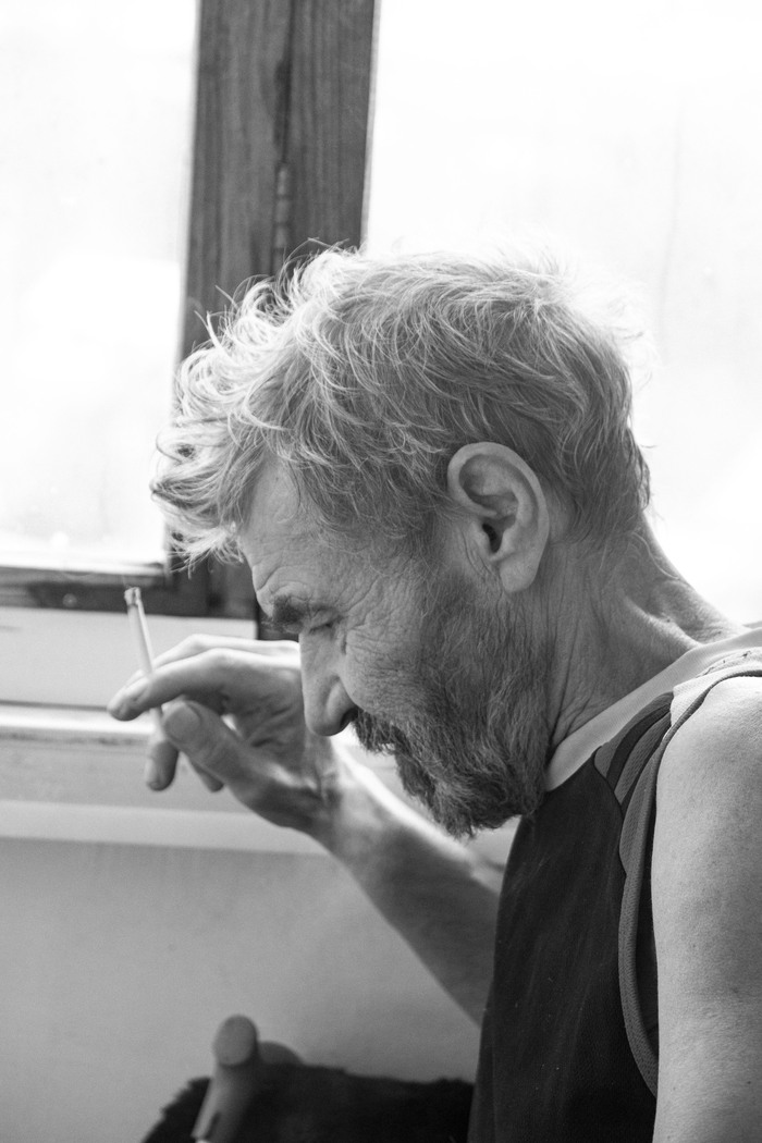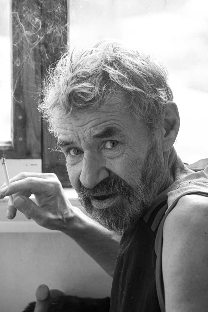 К сожалению, поставленный в ноябре диагноз - рак на IV стадии, не позволяет ему сейчас так же сидеть и курить задумчиво у окна. Прямо скажу, на фото ниже он не сильно-то хотел, чтобы я его щелкал - говорил, мол, сейчас, выздоровею, вес обратно наберу, пофоткаешь. В общем, едва ли. Но я рад, что сделал хотя бы эти снимки.