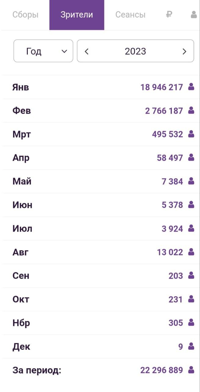 Дополнительно приведу данные с того же госпортала по двум фильмам про Чебурашку. Это информация о количестве зрителей на сеансах. Здесь мы видим, что январь у первого фильма получился лучше. Сиквел сократит отставание за последние выходные, но приблизиться и обогнать оригинал не выйдет. Удивительно, но оригинал некоторые кинотеатры крутили в 2023 году аж до декабря.