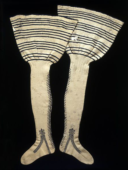 Решив связать длинные носки "с историческим уклоном", обнаружила во Всемирной паутине красивые вязаные мужские чулки середины XVII века из Музея Виктории и Альберта (Лондон), с раструбами, по форме сапог времён короля Карла Первого. Связаны они сверху вниз нитью в два сложения и украшены вышивкой.