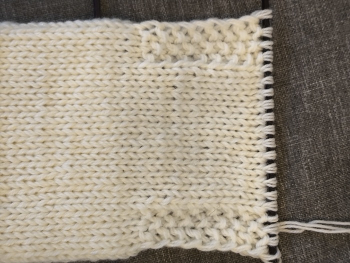Связали до начала пятки. Пятка квадратная, по краям стенки пятки вяжем по 4 петли "шахматным узором" (чередуем лицевые и изнаночные в шахматном порядке):