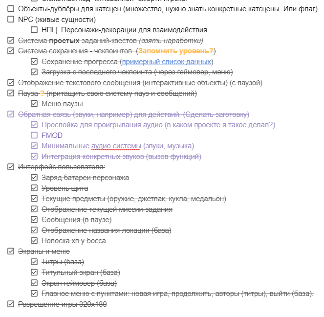 Список todo когда ещё не было сильной конкретики. Как видно — завершил я не всё. А потом появился список с большими конкретными моментами (уровни, катсцены) и ОГРОМНЫЙ список правок и изменений от чего я сильно бухтел.