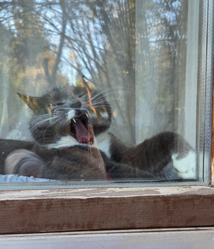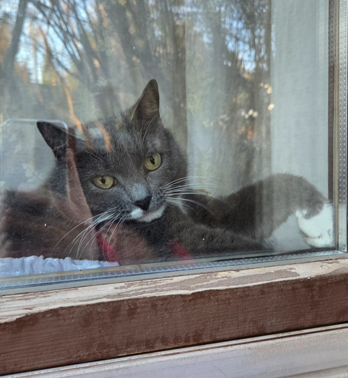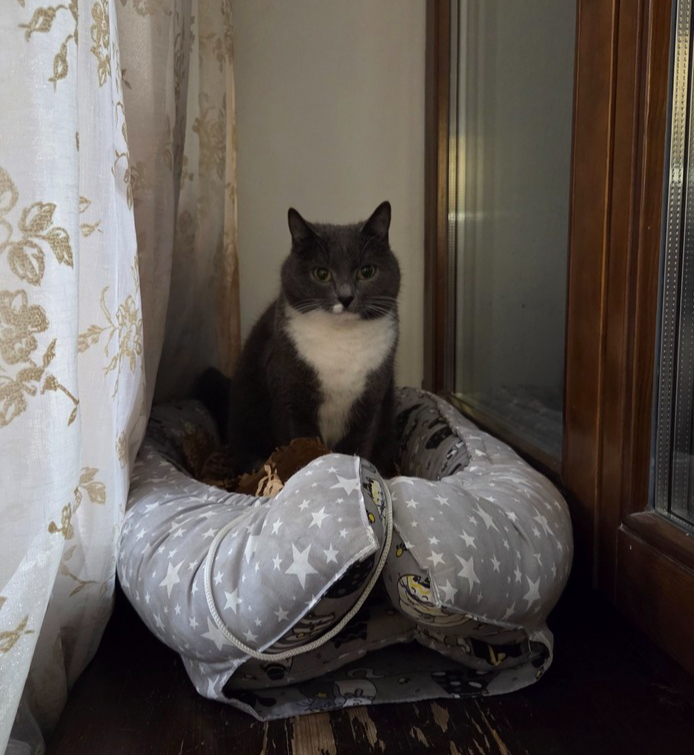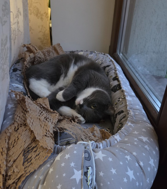 У неё теперь своё гнездо за шторой, где очень горячая батарея греет серую жопку. Иногда даже на улицу не хочет идти. Зачем? У неё всё и так прекрасно ^_^