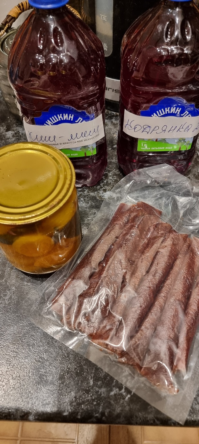 Во-первых, в посылке было 2 бутылки домашнего вина из собственного сортового винограда, самодельная пастила из слив и консервированные абрикосы! 🥹