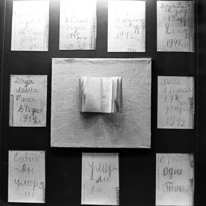 Той страшной зимой Анна нашла блокнот сестры. Вернее, это была телефонная книжка, в которой Нина вела разные записи — в основном по учебе. В декабре город завалило снегом. Его никто не убирал. Жене приходилось добираться до завода 7 километров пешком, а она еще заходила в донорский пункт. Иногда оставалась ночевать в цеху, чтобы выдержать две смены. Девушка сама не заметила, как заболела. 28 декабря 1941 года Женя умерла на руках сестры Нины. Таня в тот день взяла записную книжку и цветным карандашом написала под литерой «Ж»: «Женя умерла 28 дек в 12.00 час утра 1941 г.» Такова ее первая запись.Через несколько недель в дневнике Тани Савичевой детским почерком были начертаны уже другие строки под буквой «Б»: «Бабушка умерла 25 янв. 3 ч. дня 1942 г.». Это было самое черное время блокады — первая зима. Город погибал от голода и обстрелов. Умирая, Евдокия Григорьевна просила не хоронить ее сразу, ведь ее продуктовую карточку можно было бы использовать до конца месяца. Ее похоронили в братской могиле на Пискаревском кладбище.Надежда оставалась только на Красную армию, на защитников Ленинграда, которые не давали гитлеровцам прорваться на улицы города и сравнять его с землей, как планировали вожди Третьего рейха.В марте, в заводском стационаре, на больничной койке, от тяжелого истощения умер Леонид. Он в две смены работал на Адмиралтейском заводе. Таня записала в своей книжке под буквой «Л»: «Лека умер 17 марта в 5 часутр 1942 г.». Написать «часов утра» ей уже не хватило сил, она объединила эти два слова.Вскоре скончался и дядя Василий, не выдержавший голода и нервных перегрузок. Уже немолодой человек — ему было 56 — он продержался до 13 апреля 1942 года. Таня так и написала: «Дядя Вася умер в 13 апр 2 ч ночь 1942 г».У дяди Леши от дистрофии отказали ноги. Несколько недель он угасал. Приходил врач, но только грустно разводил руками: «Нечем помочь». Вскоре в дневнике появилась новая запись: «Дядя Леша 10 мая в 4 ч дня 1942 г.». Мама, Марья Игнатьевна, работала на производстве военного обмундирования. Старалась поддержать дочерей, особенно младшую... Но в мае сердце не выдержало. Соседи завернули в одеяло и на шаткой тележке отвезли тело Марии Игнатьевны в ангар возле реки Смоленки. Там складировали трупы со всего Васильевского острова. Таня не смогла проститься с мамой: слишком была слаба.У нее хватало сил только на короткие записи карандашом. Девочка осталась наедине с тетрадкой. 13 мая 1942 года Таня Савичева в блокадном Ленинграде сделала свои последние дневниковые записи: «Мама 13 мая в 7.30 час. утра 1942 г.». В тот же вечер в книжке появились три последние записи: «Савичевы умерли», «Умерли все», «Осталась одна Таня».