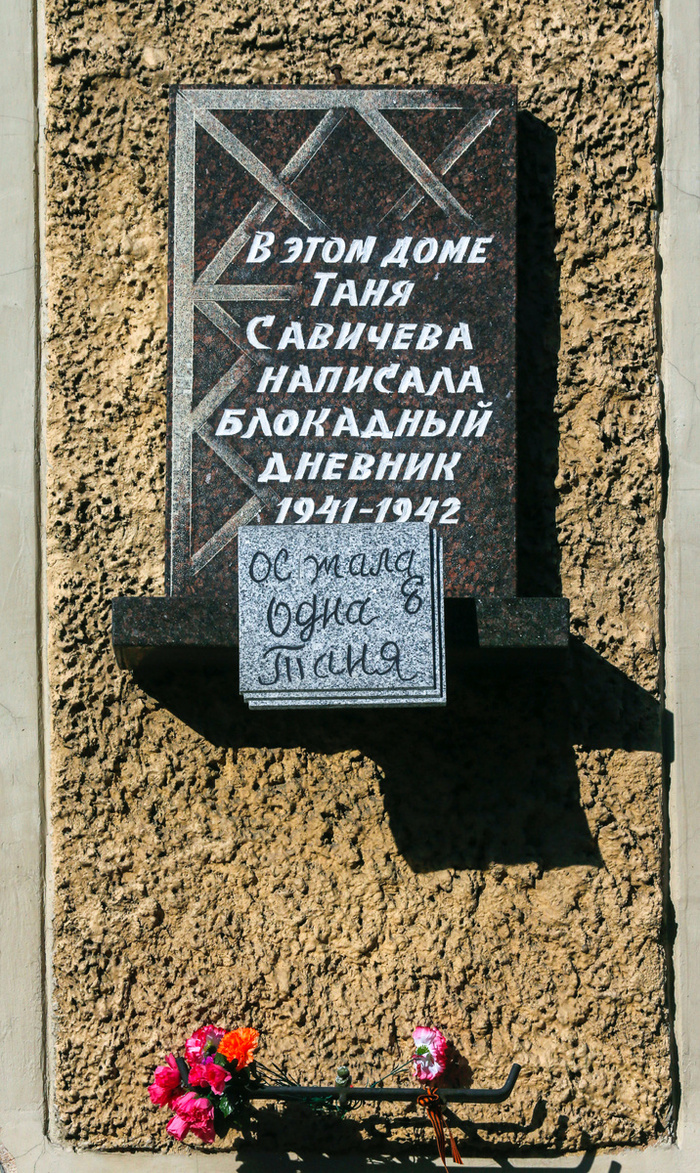 Таня ушла из жизни, не зная, что не все Савичевы погибли. Брат Миша вернулся с войны после тяжелого ранения. Сестру Нину в спешке эвакуировали из Ленинграда — так, что она не успела подать весточку родным и близким. Все считали, что она погибла при артиллерийском обстреле. В эвакуации, в Калининском районе, она тяжело болела, но выжила. И Нина, и Михаил пытались писать родным и соседям — но письма в блокадный Ленинград не доходили.Нина вернулась в родной дом на Васильевском — и нашла дневник Тани с девятью страшными записями. Она передала их ученому секретарю Эрмитажа Льву Ракову. Иногда можно услышать, что записи Тани зачитывали на Нюренбергском процессе. Вряд ли это так. У наших обвинителей было немало фактов о бесчеловечной политике нацистов по отношению к осажденному Ленинграду, который стремились погубить, стереть с лица земли без штурма, с помощью «царя-голода». Нацисты сознательно воевали с мирными людьми, пытались организовать тотальное уничтожение ленинградцев.Мемориальная табличка на доме на Васильевском острове, в одной из квартир которого в годы блокады Ленинграда жила школьница Таня СавичеваНо вся страна узнала о дневнике Тани Савичевой в 1946 году на выставке «Героическая оборона Ленинграда». Это, пожалуй, самое сильное свидетельство о преступлении нацистов в Ленинграде.Гитлеровцы сломали жизнь миллионам детей. Но достаточно узнать о судьбе Тани, чтобы понять эту боль не только умом, но и сердцем. Глядя на портрет этой девочки, мы острее ощущаем трагедию войны. Несколько строк, написанных детским почерком, рукой, слабой от голода, действуют сильнее, чем тысячи слов. В этих записях — неприукрашенная правда о войне и блокаде.Она прожила 14 лет, из них последние 2 года была инвалидом и сиротой, маленькая мученица блокады. Но прошли годы — и вся страна, весь мир знает ее имя. В народной памяти Таня не останется одинокой.