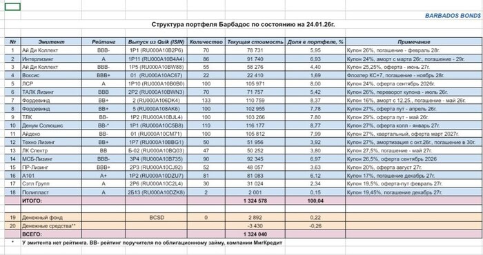 По состоянию на 24.01.26г. стоимость портфеля Барбадос составляет 1 324 040 р. Кроме того, брокеру в январе с брокерского счета портфеля Барбадос удалось списать налог за 2025г в сумме 5 206 р. Если не учитывать списанный налог, то стоимость портфеля составляла бы 1 329 246 р.