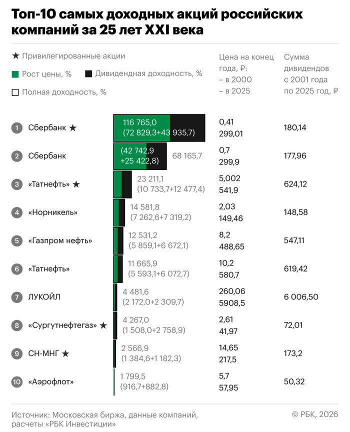 «РБК Инвестиции» определили топ-10 самых доходных акций. Временной отрезок брался от конца 2000 г. до конца 2025 г. Причем учитывался как рост котировок, так и дивиденды, которые выплачивались по этим бумагам на протяжении всех лет.