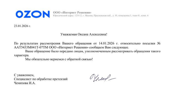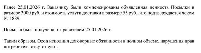 13 января Озон получает претензию, и.... (барабанная дробь) вот ответ, который они мне направляют
