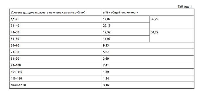 По данным специальных подсчетов распределения семей рабочих и служащих РСФСР по уровню доходов на члена семьи, выполненных вычислительным центром Госплана СССР по просьбе ЦЭНИИ при Госплане РСФСР, в 1963 году почти у 40 % рабочих и служащих (с членами семей) доходы были ниже прожиточного минимума, примерно 35 % — имели доходы от 41 до 65 рублей в расчете на душу (см. таблицу 1).