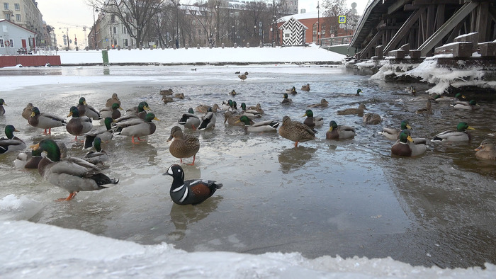 За всю историю наблюдения за птицами это первый случай появления каменушки не только в Петербурге, но и во всем нашем регионе. Ведь зимует каменушка в водах Атлантики, а гнездится на Дальнем Востоке, в Сибири, Гренландии и в Северной Америке. А вот этот красавец уже пятый год живет в нашем городе! Мы начинаем его замечать только с наступлением зимы, когда утка переодевается в свой невероятный сезонный наряд. На фоне привычных нам крякв он словно актер на сцене. А белые пятна по бокам головы похожи на огромные глаза! Ими он как будто смотрит на нас!