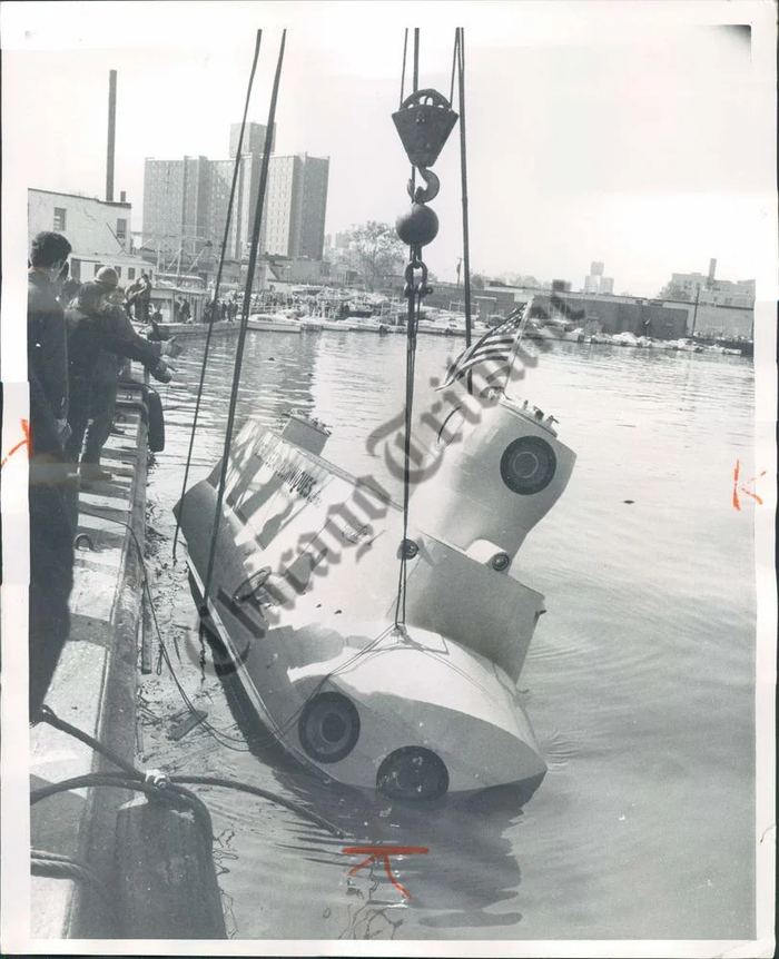 К сожалению, на этом все и закончилось. Крановщик полностью опустил подводную лодку в канал Кони-Айленд, проигнорировав указания Бьянко. Бьянко убрал балласт с одной стороны подводной лодки, чтобы сэкономить деньги, поскольку стоимость спуска рассчитывалась за килограмм, и крановщику было сказано опустить ее в воду лишь частично(находясь частично в воде планировалось заполнить балласт до конца). Как и океанский лайнер, который она должна была помочь спасти, "Желтая подлодка" сильно накренилась и начала переворачиваться. Далее возникли проблемы с выравниванием подлодки и она так и осталась наклоненной.