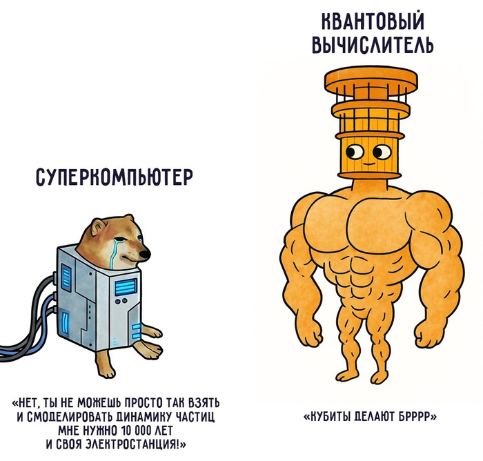 Однако есть другая мето́да ускорить вычисления, и называется она — Её Величество Квантовая Механика. Как всегда, поначалу вообще была голая теория — после появления самого понятия квантмеха учёным Ричарду Фейнману и Юрию Манину пришла в голову идея квантового компьютера. Позднее был написан алгоритм Шора, созданы первые прототипы, а в 2019-ом году компания Google продемонстрировала так называемое "квантовое превосходство", то есть произвела на своём квантовом компе расчёты, недоступные классическим суперкомпьютерам на двухбитной системе. Словом, всё это — не просто словоблудие, а вполне себе рабочая технология, которой занимаются в том числе в России, а конкретно в ФИАН и МФТИ.