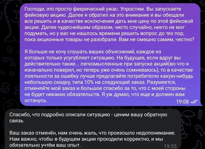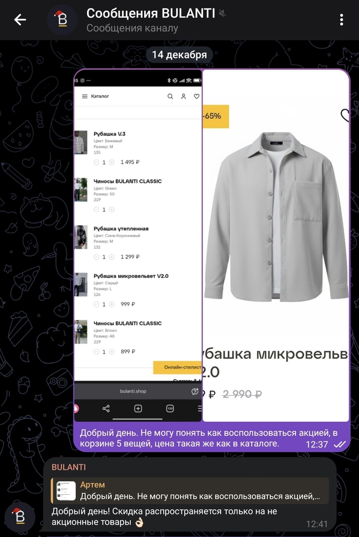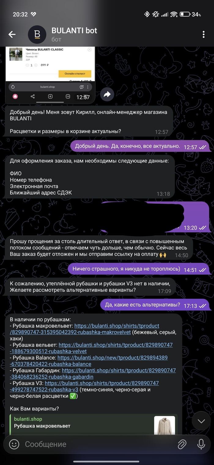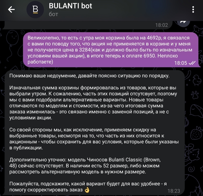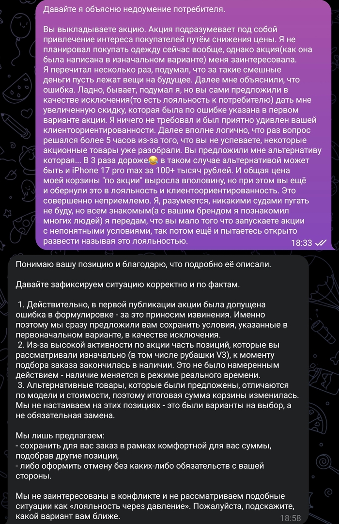 На этом моменте я понял, что дальше и говорить бессмысленно, пока мы решали вопрос, думаю, уже все акционные товары закончились, а обычная рубашка за 3790 меня не особо интересует.