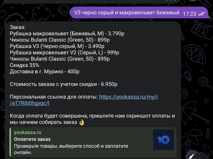 Заметим, что они снова подчеркивают: мы ошиблись в описании акции, но в качестве исключения мы для вас сделаем так, как было написано. И при этом на те позиции, которые еще есть в наличии, цена как была(например последняя позиция в корзине чиносы за 899), так и осталась уже в исправленном варианте. А где -35%? Могу ответить в рифму, но не буду. При этом цена "альтернативы" по рубашке стала вместо 999(как было изначально в каталоге) -35%(как было обещано в акции)=650р — превратилась в 3790-35%=2463. Интересная, конечно, альтернатива. Я обратил на это внимание и, разумеется, начал уже иронизировать над этими бизнесменами. Ответ, как говорится, убил: