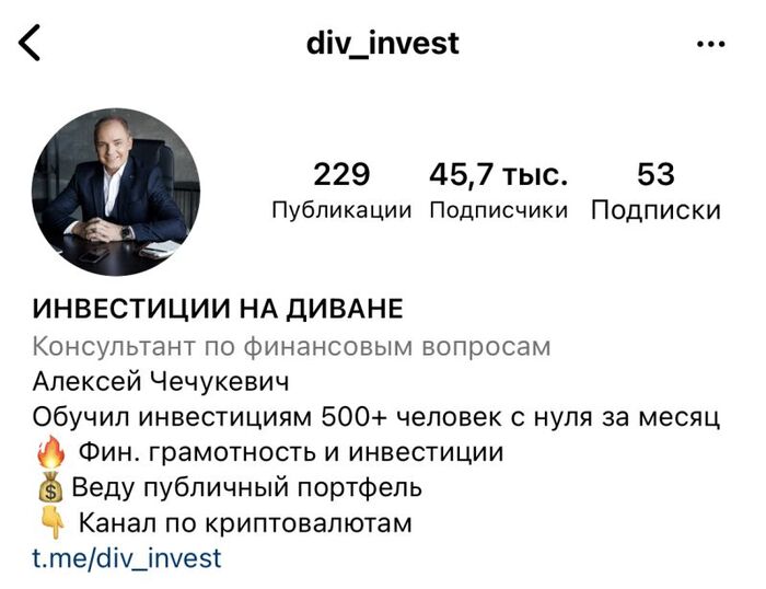 Алексей уверен, что он неплохо разбирается в инвестициях – ведь он получил базовое финансовое образование на шестимесячном курсе, а также хорошо умеет отличать разные виды салатов в супермаркете. Но в целом, г-н Чечукевич признает, что основная его экспертиза всё же лежит в области рекламного бизнеса и раскрутки Телеграм-каналов.