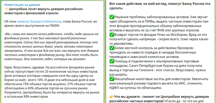 - Евгению Когану: Евгений Борисович, размещаете ли вы на своих каналах платные посты без каких-либо пометок, что это размещение было проплачено? Проводите ли вы хоть какую-то проверку достоверности информации, размещаемой на ваших каналах за деньги? Если да, то обращались ли вы в Центробанк РФ за подтверждением, что канал «Инвестиции на диване» действительно ведет бывший советник Набиуллиной Э.С.?