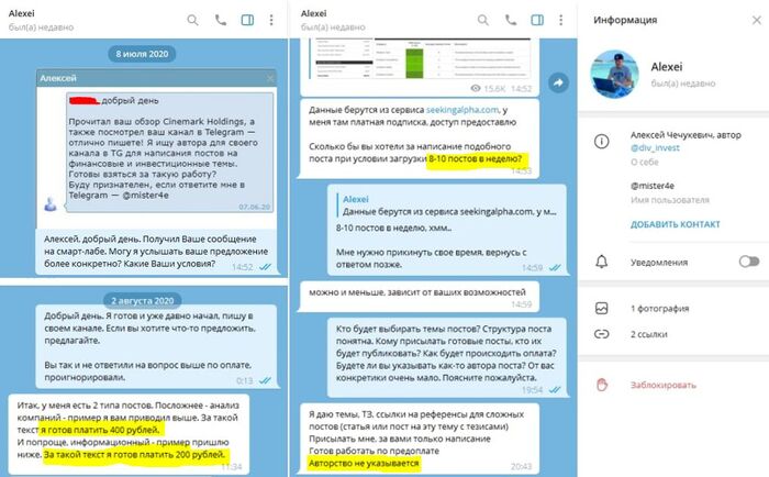 UPD: Подписчик прислал мне скрины переписки с Алексеем Чечукевичем. Это что же — выходит, наш герой нанимает других авторов, чтобы они для него переписывали материалы сайта SeekingAlpha по 200—400 рублей за пост «без указания авторства»? Или я что-то неправильно понял? Мое искреннее почтение всем 110 тысячам подписчиков канала «Инвестиции на диване» — вот уж действительно, созданы все условия для потребления контента высочайшего качества прямо с лопаты.