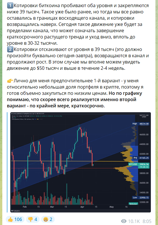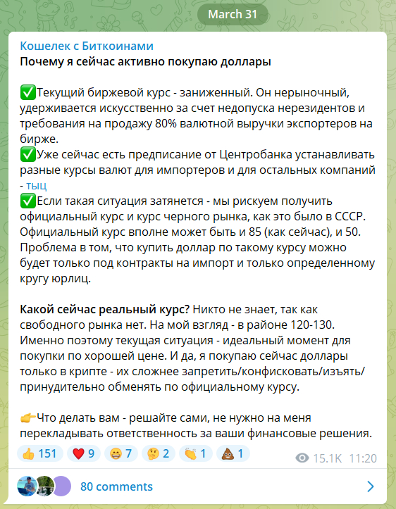 В рекламе было указано, что автор делится какими-то тайными знаниями про неминуемое достижение курсом доллара отметки в ₽30 (не иначе как Эльвира Сахипзадовна на ушко шепнула перед увольнением). Но в своем канале про крипту Алексей при этом 31 марта намекал на уникальную возможность закупиться долларами по искусственно заниженному курсу в ₽85, так как нас ждет неизбежный отскок к «реальному» курсу в районе ₽120–130. Правда, с тех пор доллар упал еще почти на 40% до ₽53…
