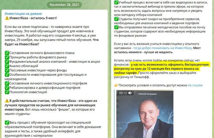 Для начинающих инвесторов у Алексея Чечукевича тоже есть актуальные предложения: например, курс «Инвестбаза», где можно с нуля получить все самые важные знания о том, как разбогатеть на фондовом рынке (по итогу обещан портфель с доходностью в 2–3 раза выше депозита). Если вам не хватает денег на покупку курса, то это не повод откладывать обучение важным навыкам – начинать богатеть вполне можно и в долг, как подсказывают на канале.