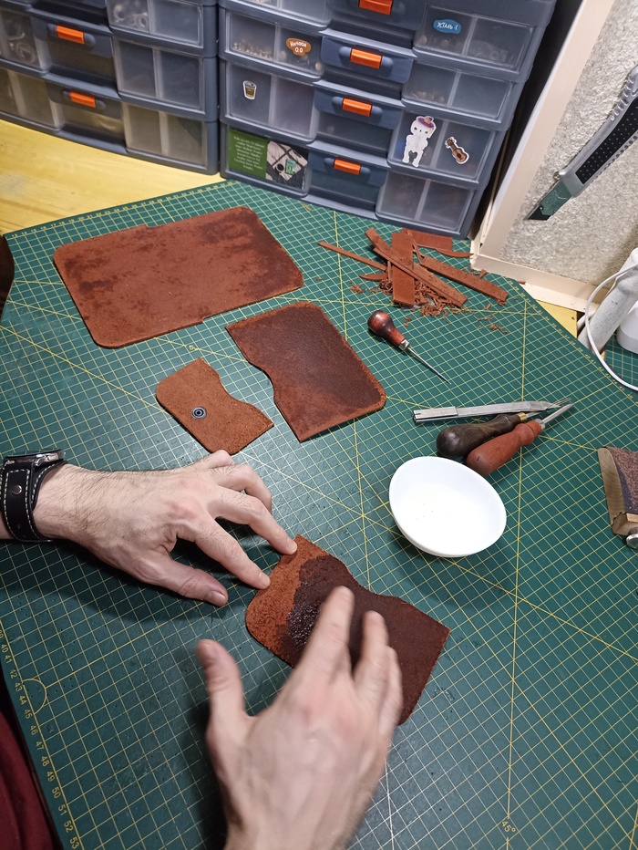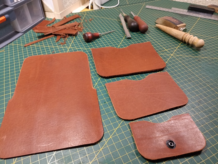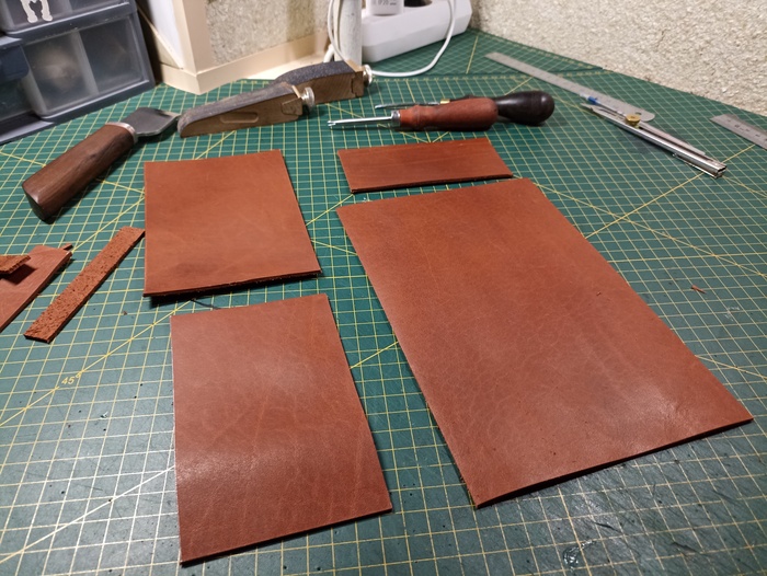 Вместе с прекрасным станком, купил уже лист нормальной кожи и лекала до кучи, чтобы было проще размечать и вырезать.