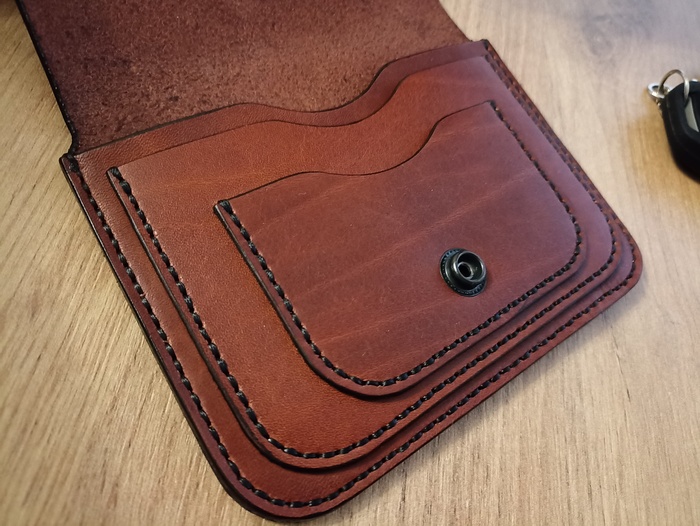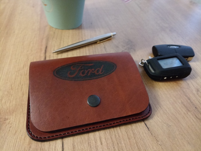 Дабы не скучать в выходные, решил сделать докхолдер для автомобильных документов. Предполагалось вместить страховку в сложенном виде, СТС и права. Завалялись у меня в мастерской обрезки плотной рыжей юфти 1.6мм. Нить выбрал плоскую плетёную, шаг пробойника 4мм. Бахтарма обработана КМЦ. Торцы обработаны традиционно Токонолом, краской Толедо и закрыты воском. Финишно кожа обработана масловоском, поэтому приобрела боле "сырой" оттенок. Весь процесс занял примерно 4 часа. Фото процесса изготовления ниже.