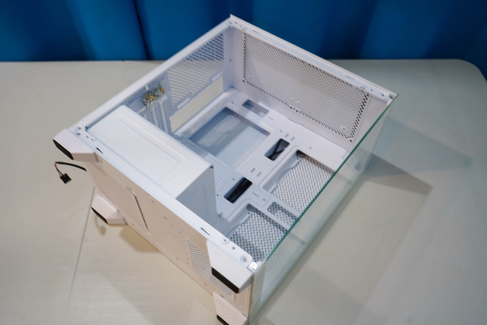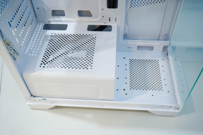 Блок питания предполагается размещать в нижней части (нижнее размещение). Для этого предусмотрен и сам отсек. и "окошки" для прокладывания кабелей. Пылевой фильтр также размещается в нижней части корпуса.