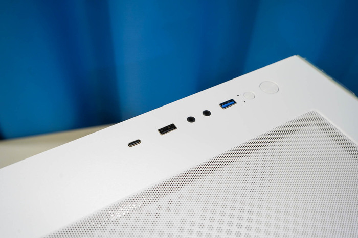 В верхнем торце корпуса, обращенному к пользователю, размещается медиа панель. Это кнопки включения/рессет, индикаторы активности, 3.5 мм jack'и (микрофон отдельно), USB Type-A и USB -С 3.2 Gen 1