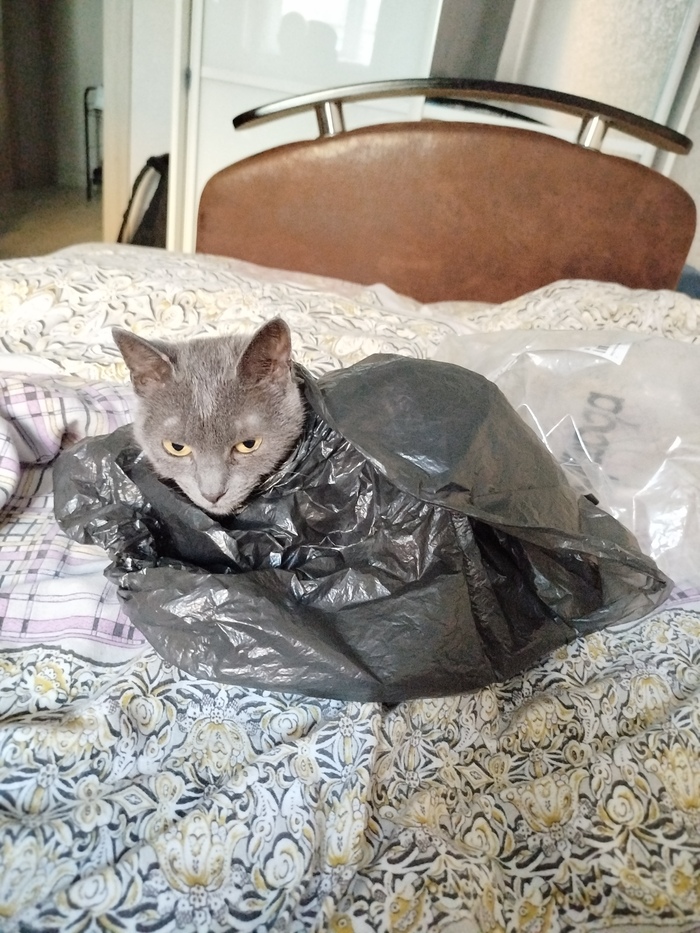 На видео в конце кожаные дали неудобную коробку, бедняжка несколько минут не могла понять как сесть поудобнее и куда деть хвостик. Очень уж странные движения она совершала им в попытках усесться х)